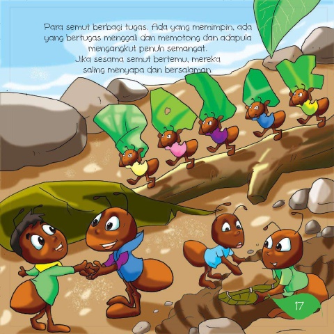 Para semut berbagi tugas. Ada yang memimpin, ada yang bertugas menggali dan memotong dan adapula mengangkut penuh semangat. Jika sesama semut bertemu, mereka saling menyapa dan bersalaman. 17
