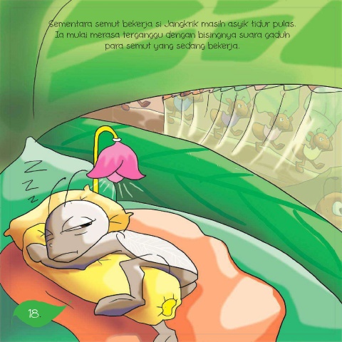 Sementara semut bekerja si Jangkrik masih asyik tidur pulas. Ia mulai merasa terganggu dengan bisingnya suara gaduh para semut yang sedang bekerja. 18.