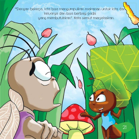 ""Dengan bekerja, kita bisa mengumpulkan makanan untuk kita dan keluarga dan bisa berbagi pada yang membutuhkan". Kata semut menjelaskan. 21