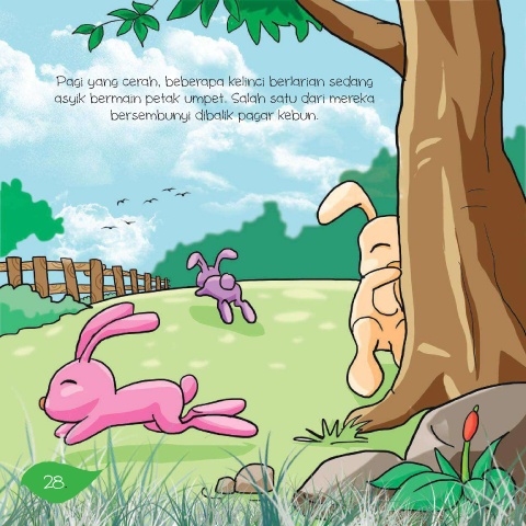 Pagi yang cerah, beberapa kelinci berlarian sedang asyik bermain petak umpet. Salah satu dari mereka bersembunyi dibalik pagar kebun. 28.